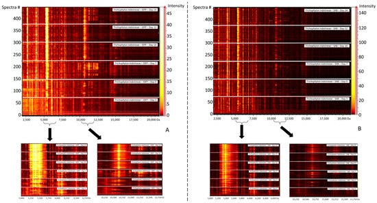 Comparison of the aligned spectra obtained at the various stages of growth for T. indotineae isolates on both IDFP (A) and SDA-CG agar (B). To visualize increases or decreases in the intensities of some peaks, a zoomed-in view of two portions of the spectra (5000–16750 Da; 10,000–11,750 Da) is shown. The highest peaks in intensity are represented by the brightest colors.