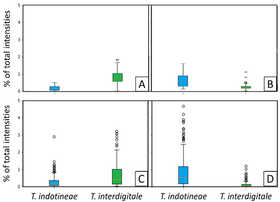 As the two groups represented for all stages of growth by a sufficient number of spectra are T. interdigitale genotype II (1108 spectra) and T. indotineae (905 spectra), we compared the spectra of those two species to search for specific peaks after a pretreatment step of the spectra, consisting of baseline subtraction, smoothing, alignment, and normalization of the intensities. Boxplots were then computed to compare peak intensities in relation to the species (T. interdigitale genotype II versus T. indotineae).