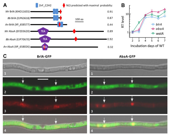 The amino acid sequences of BrlA (KHO11655) and AbaA (EFZ03620) orthologs identified in the NCBI database of M. robertsii [39] were much less identical to the queries of A. nidulans (36.57% and 41.9%; e-values: 12 × 10−09 and 8 × 10−12; scores: 57.4 and 67.8; coverage: 20% and 10%, respectively) than those (72.46% and 68.37%; e-values: 7 × 10−157 and zero; scores: 444 and 1174; coverage: 100% and 100%) studied previously in B. bassiana [31]. Despite low sequence identity, the identified BrlA and AbaA orthologs (Figure 1A) featured two typical zinc-finger (ZnF-C2H2) domains at C-termini and an N-terminal TEA domain required for DNA binding [47], respectively. Notably, the BrlA zinc-finger domains in the three fungi were similar in size (23–26 amino acids (aa) per capita) while the AbaA TEA domain differed largely in molecular size between A. nidulans (70 aa) and the two insect pathogens (125 or 131 aa). Interestingly, a maximal probability predicted for an NLS motif of BrlA or AbaA in B. bassiana (0.87 or 0.92) or M. robertsii (0.91 or 0.89) was much greater than that in A. nidulans (0.44 or 0.32). For the brlA orthologs, additionally, the putative transcription units brlAα, brlAβ, and μORF found in M. roberstii showed low homology to those identified previously in A. nidulans [48] (Figure S2).