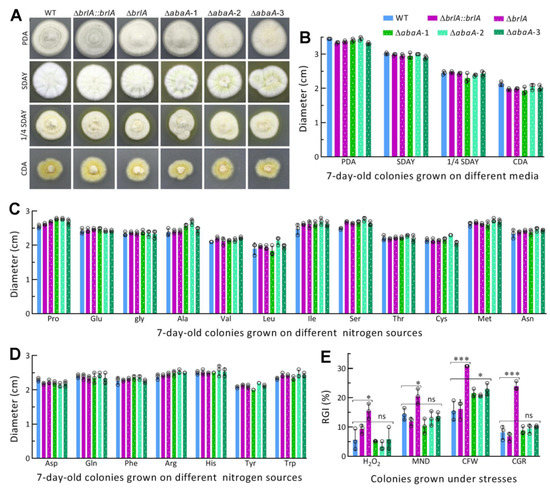 Impact of brlA or abaA disruption on radial growth and stress response of M. robertsii. (A,B) Images and diameters of fungal colonies grown at the optimal regime of 25 °C and L:D 12:12 for 7 days on nutrition-rich (PDA, SDAY, and 1/4 SDAY) and minimal (CDA) media. (C,D) Diameters of 7-day-old fungal colonies grown at the optimal regime on CDA amended with different amino acids as nitrogen sources. (E) Relative growth inhibition (RGI) percentages of fungal colonies grown at 25 °C for 7 days on CDA plates supplemented with H2O2 (2 mM), menadione (MND, 0.03 mM), calcofluor white (CFW, 15 μg/mL), and Congo red (CGR, 1 mg/mL) respectively. All colonies were initiated with hyphal mass discs (ϕ = 5 mm) attached to plates. p < 0.05 * or 0.001 *** in Tukey’s HSD tests (ns, no significance). Error bars: SDs from three independent replicates.
