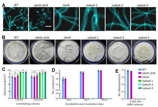 - Zhang, A.X.; Mouhoumed, A.Z.; Tong, S.M.; Ying, S.H.; Feng, M.G. BrlA and AbaA govern virulence-required dimorphic switch, conidiation and pathogenicity in a fungal insect pathogen. mSystems 2019, 4, e00140-19. [Google Scholar] [CrossRef] [PubMed]