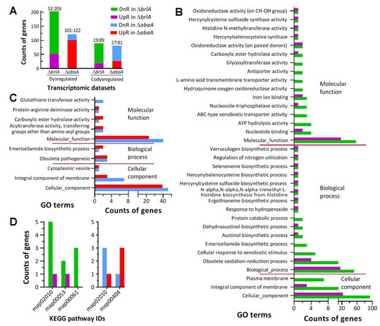 Effect of brlA or abaA disruption on gene expression networks of M. robertsii. (A) Counts of genes dysregulated and co-dysregulated in the ΔbrlA and ΔabaA-1 mutants versus the WT strain. (B,C) Counts of dysregulated genes significantly enriched (p < 0.05) to GO terms of three function classes in ΔbrlA and ΔabaA-1, respectively. (D) Counts of dysregulaated genes significantly enriched (p < 0.05) to KEGG pathways in the two mutants. The transcriptome was constructed based on three 4-day-old cultures (replicates) of the ΔbrlA, ΔabaA-1,and WT strains. All dysregulated genes were identified at the significant levels of log2 ratio (fold change) ≤−1 (downregulated, DnR) or ≥1 (upregulated, UpR) and q < 0.05.