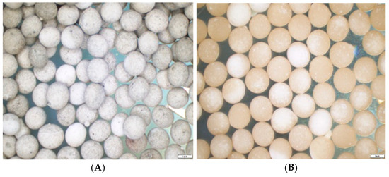 Fungal (M. anisopliae) granules (CAGMa+Cs+By) (A) characterized with Ø = 3.5 mm, weight 25 mg per granule, 9 × 106 conidia per granule and food (control) granules (CAGCs+By) (B) as the control treatment.
