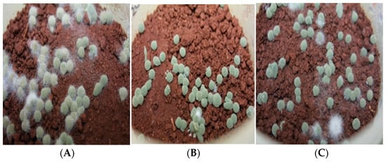 Resporulated M. anisopliae granules inoculated in field soil (A), fumigated soil (B) and pasteurized soil (C) 10 days post-incubation.