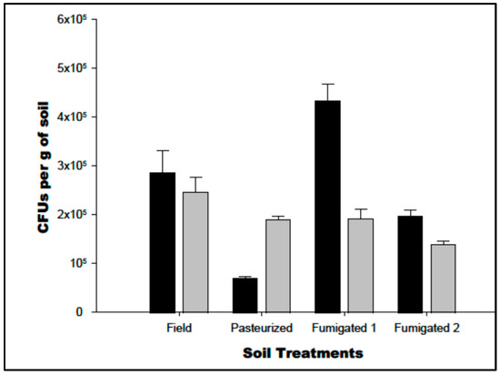 The colony-forming units (CFUs) present on standard nutrient agar (NA: black) or potato dextrose agar (PDA: Grey) media soil sourced from field soil, pasteurized soil, fumigated soil with soil sampled from the top fumigant-treated area (fumigated 1) and fumigated soil with soil sampled from homogenized fumigated soil (fumigated 2).