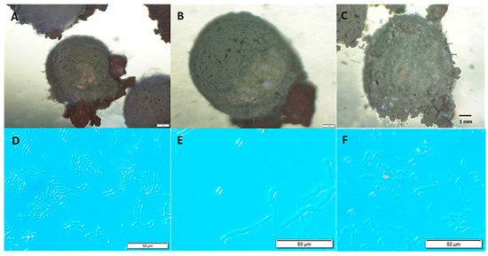 To determine the amount of resporulation from the M. anisopliae granules at 10 days post-incubation, three M. anisopliae granules (CAGMa+Cs+By) or food granules (CAGCs+By) were randomly removed from each container using sterile tweezers (Figure 2A–C). The conidial resporulation from the granules was determined by inserting an individual M. anisopliae granule into a tube (2 mL) containing 1 mL of sterile 0.05% Tween® 80 solution. The tubes were agitated using a vortex for 2 min to dislodge the conidia from the granule.