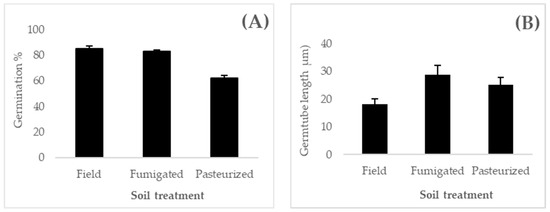Percentage germination of extracted conidia from resporulated fungal granules applied on either field or fumigated or pasteurized soil for 10 days (p < 0.05) (A) and measurement of germ-tube length from the conidia extracted from the resporulated fungal granules (p < 0.05) (B).