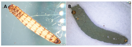 A dead larval mealworm recovered from fumigated soil containing resporulated fungal granules at 8 days post-inoculation with fungal inocula (A) a larval mealworm with profuse sporulation following placement in a moist chamber for 4 days (B).