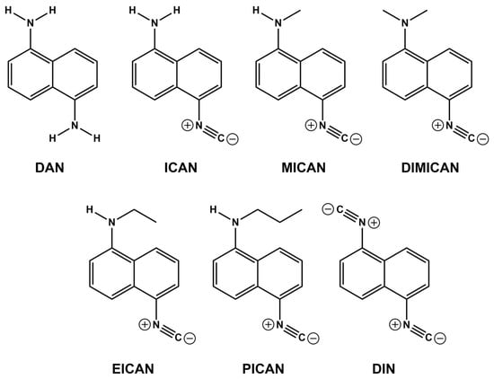 1,5-diaminonaphthalene (DAN) was purchased from Sigma-Aldrich (Schnelldorf, Germany) and used as received. 1-amino-5-isocyanonaphthalene (ICAN), 1-N-methylamino-5-isocyanonaphthalene (MICAN), 1-N,N-dimethylamino-5-isocyanonaphthalene (DIMICAN) and 1,5-diisocyanonaphthalene (DIN) were synthesized and characterized as described previously [33,34]. The synthesis procedure for 1-N-ethylamino-5-isocyanonaphthalene (EICAN) and 1-N-propylamino-5-isocyanonaphthalene (PICAN) as described previously [31].