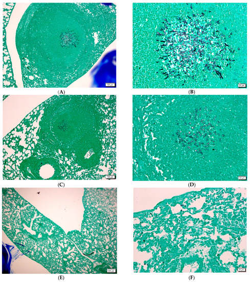 Hyphae were visible in the lungs of infected animals and infected animals treated with amphotericin B (Figure 3A–F). We found more hyphae in infected untreated animals than in infected and AMB-treated animals (Figure 3A–D).