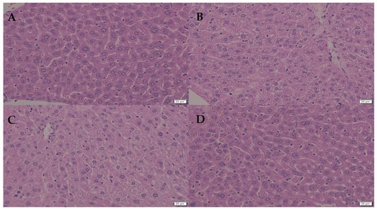 (A): control. (B): the effect of olive oil on the hepatocytes. (C): the effect of DIMICAN is visible in hepatocytes in not infected animals. (D): Ten days after DIMICAN treatment (A) hepatocytes were similar as control (A). Scale bars are 20 µm.