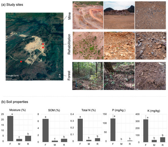 Study sites and soil physicochemical properties. (a) Study site locations with an overview of the semi-opencast limestone mine and photos of three study sites including natural forest (F), mining site (M), and rehabilitation plots (R); (b) Soil physicochemical properties, including moisture, soil organic matter (SOM), total nitrogen (Total N), phosphorous (P), and potassium (K). Different lowercase letters (a, b and c) indicate significant differences.
