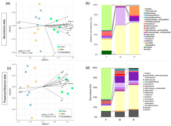 Fungal diversity and taxonomic distribution across three study sites, including forest (F), mining (M), and rehabilitation plots (R): fungal community compositions based on (a) Bray–Curtis and (c) Jaccard dissimilarity measure and taxonomic distributions based on (b) abundance and (d) presence/absence data.