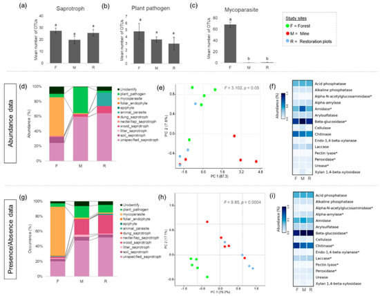Functional profile predicted by FungalTraits and PICRUSt2. Bar plot shows the average number of OTUs ascribed to different fungal traits, including (a) Saprotroph (b) Plant pathogen and (c) Mycoparasites. Stack bar plots present fungal traits distribution among three study sites based on (d) abundance data and (g) presence/absence data. PCA ordinations show the composition of PICRUSt2-predicted enzymes based on (e) abundance OTU data and (h) presence/absence OTU data. The average number of 15 important soil enzymes based on (f) abundance OTU data and (i) presence/absence OTU data were shown in heatmap. Enzymes with asterisk present statistically significant (p < 0.05). Different lowercase letters (a and b) indicate significant differences.