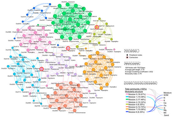 To determine the insightful structure of fungi in the harsh environment of the limestone quarry, co-occurrence network, network properties, and critical hubs were calculated and identified. In detail, the network consisted of 126 OTUs (nodes) with 702 connections (edges) (Table S5). The average path length and average clustering coefficients were 5.79 and 0.832, respectively. A modularity index of the network was 0.79, which suggested that the network had a modular structure. Specifically, nine modular communities were generated in this study (Figure 4). Whilst Module 0, Module 1, and Module 7 were dominated by Aspergillus species, Module 2, Module 6, and Module 8 were dominated by Hypoxylon, Penicillium, and Fusarium, respectively. Based on Zi and Pi scores, there were three nodes, belonging to OTU0004 (Aspergillus flavus), OTU0014 (Hypoxylon sp.), and OTU0113 (Curvularia affinis) that were found to be connectors of this network. Other nodes were classified as peripheral nodes. Furthermore, we found that each modular community was significantly correlated with different soil properties (σ > 0.7, p < 0.05; Figure 4). Total fungal community in this area was significantly correlated to SOM, N, Ca, Fe, Mn, and percentage of sand (Figure 4).