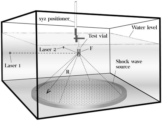 As shown in Figure 1, the experimental shock wave generator consists of a Lucite water tank (base 675 × 675 mm, height 450 mm) with a precision xyz positioning system UniSlide Assemblies (Velmex, Inc., Bloomfield, NY, USA) mounted on top of it. A piezoelectric shock wave source (Piezolith 2501, Richard Wolf GmbH, Knittlingen, Germany) was used to generate either single-pulse or tandem shock waves by high-voltage discharges applied to an array of 3000 piezoelectric crystals mounted on a hemispherical bowl-shaped backing. Approximately 230 µs after the electric discharge, a shock wave arrives at the center of the sphere (F). The electroacoustic transducer is self-focusing because of the spherical shape of the arrangement. The nonlinearities and steepening of the pressure pulse during propagation produces a shock wave at the focal zone. The concave side of the shock wave source at the bottom of the tank is insulated by a polymer. To be able to generate tandem shock waves at the desired delay, a pulse generator triggers two discharge circuits, that is, two capacitors are charged by a high voltage transformer until their trigger is fired. With this system, two shock waves can be emitted with an adjustable delay between 50 and 950 μs. The experimental setup was performed according to what is described in a previous publication [29].
