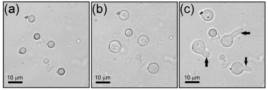 Optical microscope images showing A. niger conidia (a) at 0 h, i.e., just after being inoculated in the culture medium, (b) during swelling or isotropic growth after 6 h, and (c) after germ tube formation or polarized growth (see arrows) at 8 h.