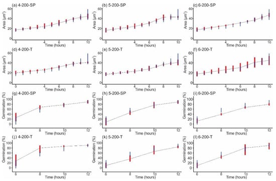 Swelling of conidia versus time after exposure to 200 single-pulse (SP) shock waves generated at (a) 4 kV, (b) 5 kV, and (c) 6 kV, and to 100 tandem (T) events (200 shock waves), generated at (d) 4 kV, (e) 5 kV, and (f) 6 kV. Moreover, it shows the percentage of conidia that formed a germ tube after being exposed to 200 SP shock waves generated at (g) 4 kV, (h) 5 kV, and (i) 6 kV, and to 100 tandem (T) events (200 shock waves) generated at (j) 4 kV, (k) 5 kV, and (l) 6 kV. The graphs resulted from dots corresponding to the average of 100 conidia measured. Vertical red lines represent 95% bootstrap intervals of the growth of shock-wave-treated conidia, and vertical blue lines refer to the 95% bootstrap interval of the control experimental groups. Overlapping intervals indicate a nonsignificant difference.