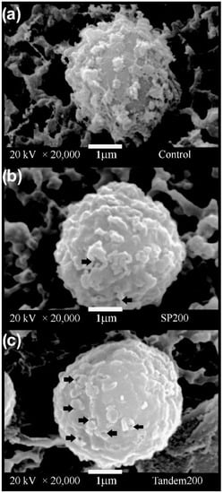Scanning electron micrographs of Aspergillus niger conidia exposed to (a) 0 shock waves, (b) 200 single-pulse shock waves and (c) 100 tandem events. Arrows indicate the presence of pores on the cell wall surface. When compared with the image of a control cell as in (a), it is evident that the surface of the shock-wave-treated cells (b,c) looks smoother.