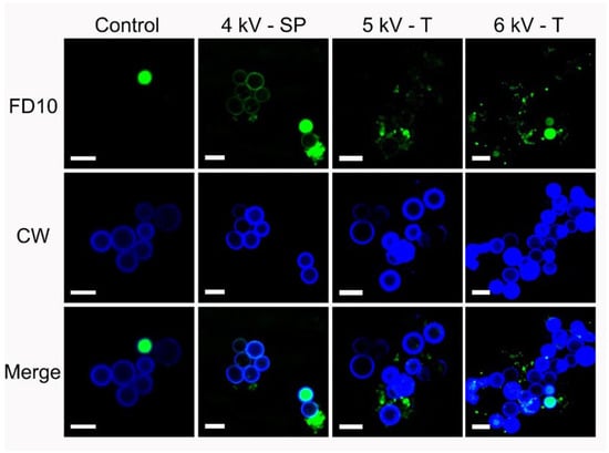 Confocal microscopy images showing the permeabilization of Aspergillus niger conidia after exposure to 200 single-pulse shock waves (SP) generated at 4 kV, and 200 tandem shock waves (T) generated at 5 and 6 kV. Representative images of nontreated cells are shown in the first column (Control). FD10 was assessed with merge fluorescence of calcofluor white dye. Scale bar: 5 µm.