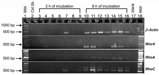 Agarose gel electrophoresis of PCR amplification of β-Actin, Wsc4, RhoA and RhoC genes of Aspergillus niger conidia after exposure to underwater shock waves and 2 and 8 h of incubation. Lane 1: molecular weight (MW) DNA size marker; Lane 2: control 0 h; Lane 3: control 2 h; Lane 4: 4 kV single-pulse; Lane 5: 5 kV single-pulse; Lane 6: 6 kV single-pulse; Lane 7: 4 kV tandem shock waves; Lane 8: 5 kV tandem shock waves; Lane 9: 6 kV tandem shock waves; Lane 10: control 8 h; Lane 11: 4 kV single-pulse; Lane 12: 5 kV single-pulse; Lane 13: 6 kV single-pulse; Lane 14: 4 kV tandem shock waves; Lane 15: 5 kV tandem shock waves; Lane 16: 6 kV tandem shock waves; Lane 17: negative control; Lane 18: MW.