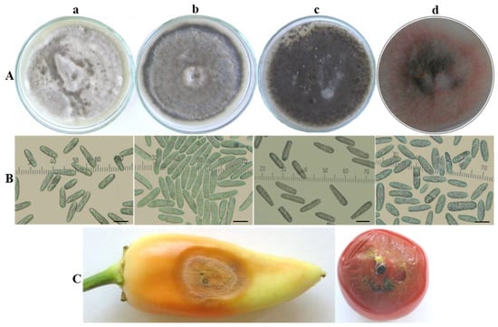 The isolates obtained from pepper, tomato, and eggplant fruits developed white circular colonies on PDA and become grey with age, with a narrow pink sporulating periphery and well-defined concentric zones with microsclerotia. The surface was mainly covered by grey creeping mycelium. Unevenly distributed white to light grey tufts of sparse cottony aerial mycelia were occasionally observed (Figure 4A).