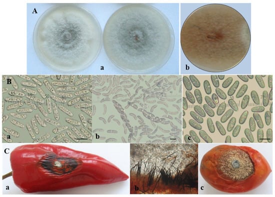 Colletotrichum gloeosporioides group. (A) Colony morphology of: C. cigarro (a) and C. musae (b); (B) sporulation: conidia (a) and ascospores (b) of C. cigarro; conidia of C. musae (c); scale bars = 10 µm; (C) advanced symptoms caused by C. cigarro (isolate CgD6-1) on artificially inoculated detached fruits of: pepper—(a) dark dry wrinkled lesion; (b) black sporulating setose acervuli just beneath the skin of the infected fruit (×16) and (c) tomato.