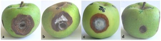 Pathogenicity tests on green apples, conducted according to Talhinhas et al., 2008 [51], performed with different Colletotrichum species: (a) C. nymphaeae (Ca13-1); (b) C. salicis (Ca44-1); (c) C. cigarro (CgD6-1); (d) C. coccodes (Cc7-1). Designations of the isolates used for inoculation are shown in parentheses.