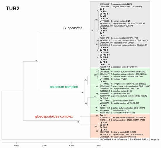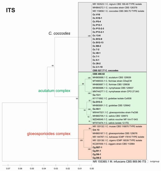 Based on our preliminary phenotypic and genotypic (ITS region of ribosomal DNA) characteristics and pathogenicity tests [45,47], the isolates were divided into three groups: Group 1—C. acutatum (3 isolates and CBS 490.92 strain), Group 2—C. gloeosporioides (4 isolates and C. musae) and Group 3—C. coccodes (16 isolates and CBS 527.77 strain). Three of the isolates in the third group (Cc7-1, Cc7-2 and Cc26-2) originated from the Republic of North Macedonia, collected during field expeditions. Fungal isolations and further investigations were performed at the IPPG.