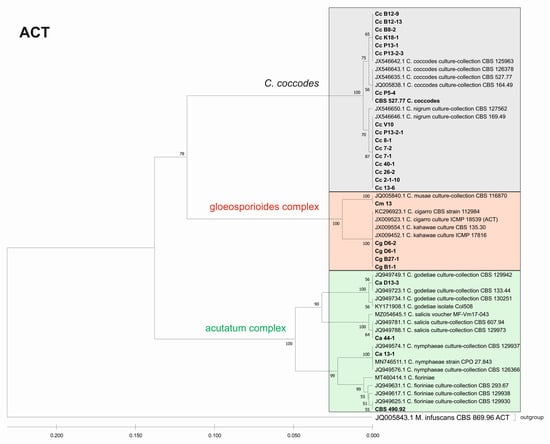 The consensus tree based on the concatenated sequences of the four barcode regions ITS_ACT_EF_TUB entirely confirmed the species affiliations and phylogenetic relationships observed in the individual trees (Appendix A, Figure A1). The isolates were clustered into the three major clades, C. acutatum, C. gloeosporioides, and C. coccodes, with 100% bootstrap support. The four isolates belonging to the acutatum complex were clearly differentiated as different species, such as C. godetiae (isolate CaD13-3), C. salicis (Ca44-1), C. nymphaeae (Ca13-1), and C. fioriniae (reference strain CBS 490.92). The identification of the CgB1-1, CgD6-1, CgD6-2, CgB27-1 isolates as C. cigarro was also conclusively demonstrated. The C. coccodes isolates were divided into two subgroups—the first contained nine isolates identified as C. nigrum and the second included eight isolates identical to C. coccodes. Genetic variation within the respective groups of C. coccodes and C. nigrum isolates revealed by the individual trees was also evident from the consensus tree.