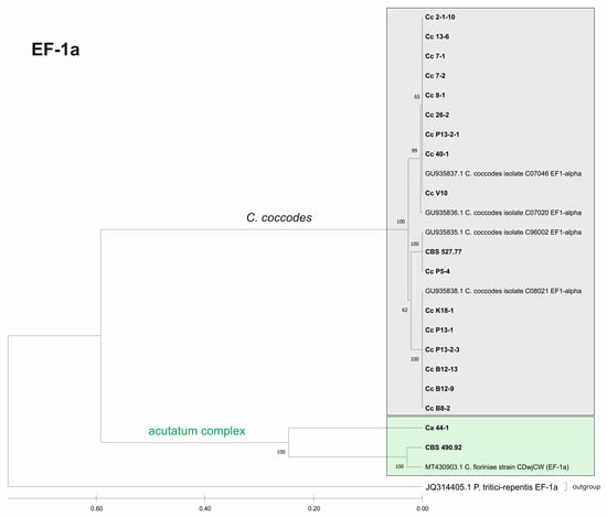 The phylogenetic trees based on the barcode regions ITS, ACT, and TUB2 clearly clustered the isolates into three main clades with 100% bootstrap support: C. acutatum, C. gloeosporioides, and C. coccodes. Two subgroups can be distinguished in the C. acutatum clade based on the ITS, ACT, and TUB2 regions. The first one comprised the isolate from tomato CaD13-3, identified as C. godetiae, and the isolate Ca44-1 closely related to C. salicis. The second subgroup included Ca13-1, identified as C. nymphaeae, together with the reference strain CBS 490.92. Here, this strain clustered with C. acutatum samples and was identical with the C. fioriniae and C. acutatum (s.s.) strains. The four isolates were genetically well differentiated, which proves that each of them is actually a different species. For EF-1a, there were a limited number of sequences available in the GenBank that were homologous to this particular fragment of the C. acutatum isolates; therefore, it was not possible to determine the exact affiliation of C. acutatum strains based on these sequences.