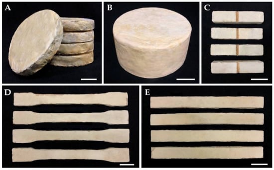 For the compression test, molds were made from cylindrical plastic boxes with a ratio between the diameter and height of 2:1 (86 mm in diameter and 43 mm in height) according to the method described by Elsacker et al. []. The mold for the water absorption test was made from a plastic dish that was 85 mm in diameter and 13 mm in height. Moreover, the molds employed for the tensile, flexural, and impact tests were designed from acrylic clear sheets that were cut into a dumbbell-shaped segment (165 × 19 mm, neck 57 × 13 mm, a rectangular shape (127 × 12.7 × 3.2 mm), and a rectangular shape (63.5 × 12.7 × 12.7 mm), respectively, following the standard method of the American Society for Testing and Materials (ASTM) [,].