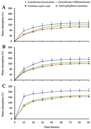 The water absorption ability of the obtained MBCs was determined by submerging the composites in water over a period of 96 h. It was found that the water absorption ability of the MBCs made from rice straw increased over a 24 h period and slowly stabilized after 36 h, whereas the water absorption ability of the MBCs made from corn husk and sawdust increased over a period of 60 h and slowly stabilized after 72 h (Figure 3). MBCs obtained from rice straw displayed the highest degree of water absorption ability, followed by MBCs obtained from corn husk and sawdust. The results also revealed that MBCs produced from L. sajor-caju exhibited lower water absorption ability in all the substrate types, while MBCs produced from S. commune exhibited a significantly high degree of water absorption ability in all substrate types. This study found that the water absorption ability decreased when the degree of density was increased. This result is in full agreement with the results of a number of previous studies, wherein the high degree of density of MBCs was reduced in accordance with their relevant water absorption ability [,,,]. After 96 h, the water absorption ability (105.07–208.82%) was observed to be within the ranges described in previous reports at 24.45 to 560% when left in contact with water for a period of 24–192 h (Table 2).