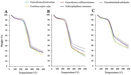 All of the MBCs obtained in this study were found to be similar in terms of the degradation behavior of each lignocellulosic residue throughout all three stages of development (Figure 4). The first stage (free and chemically linked water evaporation resulting in about 5% mass loss) was observed to occur between 25 and 150 °C, followed by the second stage (degradation resulting in about 70% mass loss) and the third stage (decomposition), both of which were observed at temperatures in ranges of 200 and 325 °C and 350 and 375 °C, respectively. The results of this study were similar to the outcomes of several prior studies, which reported that the thermal degradation behavior of MBCs was comprised of three stages identified as the first, second, and third stages, and were recorded at temperatures within ranges of 25 to 200 °C, 200 to 375 °C, and at temperatures greater than 350 °C, respectively, all of which were related to the degree of thermal degradation of each used lignocellulosic residue [,,,,,,,]. This study found that each uncolonized lignocellulosic residue had a slightly slower mass loss than the MBCs in the same lignocellulosic residues. This outcome was in accordance with the findings reported by Appels et al. [] and could be explained by the fact that fungal colonization can change the composition of lignocellulosic residues that are susceptible to thermal degradation.