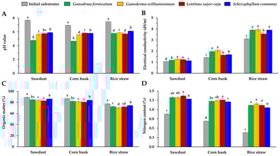 In this study, the chemical properties, including pH value, electrical conductivity (EC), organic matter content, and nitrogen content of MBCs were investigated, and are presented in Figure 5. The initial pH values of the three growing substrates used, including sawdust, corn husk, and rice straw, were averaged at 7.71, 6.96, and 7.49, respectively. The final pH values of the obtained MBCs in the sawdust, corn husk, and rice straw were within ranges of 4.78–5.91, 4.67–5.81, and 5.28–6.12, respectively (Figure 5A). This indicates that the final pH values of MBCs were significantly decreased from the initial pH value of the growing substrate. This finding was in accordance with the outcomes of several prior studies, which reported that the finished MBCs exhibited lower pH values than the initial pH values of the growing substrates [,,]. Attias et al. [] found that the pH levels of MBCs produced from P. ostreatus and P. salmoneo (grown on woodchips of eucalyptus, pine, and apple trees) significantly decreased (4.3–4.7) when compared with the initial pH values of all selected substrates at around 5–5.5. This decrease in the pH values was generally caused by the enzymatic digestion process that took place during the growth of the fungal mycelia on the substrate [,].