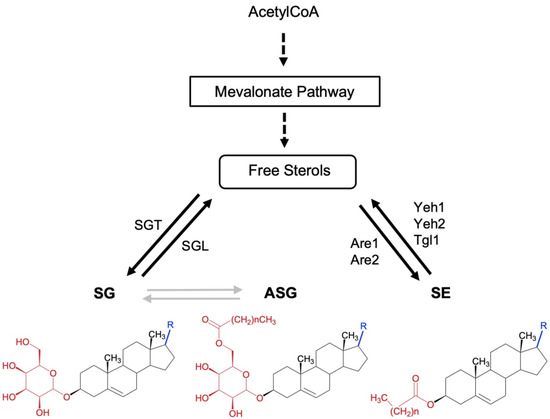 Schematic overview of conjugated sterol metabolism in fungi. The chemical structure of free and conjugated sterols sterylglucosides (SG), acyl Sterylglucosides (ASG), and sterol esters (SE). Dashed arrows indicate multiple steps. The position of the enzymes sterol glycosyltransferase (SGT) and sterylglucosidase (SGL) is indicated. SGs are characterized by having a sugar linked to the C3 hydroxyl group of the sterol moiety through a β-glycosidic bond. ASGs are derivatives of SGs in which the hydroxyl group of the C6 position of the sugar moiety is acylated by sterol glycoside acyltransferase (SGA), however, no SGA has been characterized in fungi to date. Gray arrows represent enzymatic pathways still to be characterized. In SEs the hydroxyl group at the C3 position is esterified with a fatty acid by sterol O-acyltransferases, named Are1 and Are2 in Saccharomyces cerevisiae, which catalyzes the formation of sterol esters and act in concert with the sterol ester hydrolases Yeh1, Yeh2, and Tgl1.