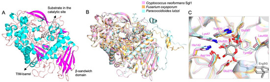 SGL1 homologs structural comparison. (A) Cryptococcus neoformans Sgl1 structure (PDB: 7LPO) with ergosterol 3β-D-glucoside (gray) docked in the active site. (B) Fusarium oxysporum (orange) and Paracoccidioides lutzii (cyan) Alphafold models superposed on Sgl1 (pink) structure. (C) The residues on the glucose binding site are conserved in a similar position in F. oxysporum and P. lutzzi models. Sgl1 residues are shown in pink.
