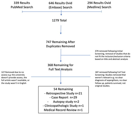 Following an extensive search of Pubmed, Embase (Ovid) and Medline (Ovid) databases using the search criteria, a total 1279 papers were retrieved (Figure 1). These comprised 339 papers from Pubmed, 646 from Embase (Ovid) and 294 from Medline (OVID). 532 papers were removed due to duplication, leaving 747 papers in total. Initial screening of titles and abstract removed 379 irrelevant papers, leaving 368 papers for full text analysis. When attempting to retrieve the full texts, 127 papers were removed due to being inaccessible (Supplementary data), although review of all these papers’ titles did not reveal any which could materially contribute to the question. Another 187 full texts were also removed as they did not meet the inclusion/exclusion criteria. This left 54 papers that were included in this systematic review (Table 1). These comprised 29 case reports, 21 retrospective studies, 2 autopsy studies, 1 clinico-pathological study and 1 medical record review (Figure 1). Most cases, if not all, were cases of invasive aspergillosis.