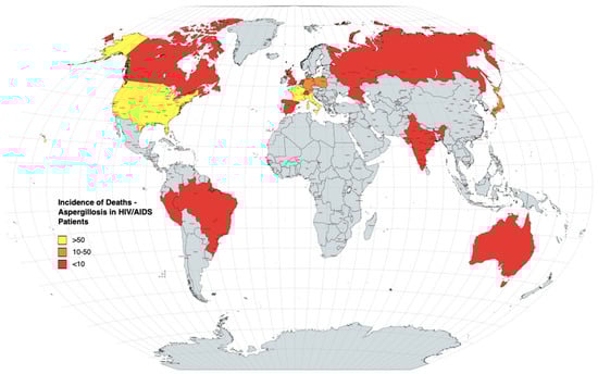 Numbers of deaths linked to aspergillosis in HIV/AIDS patients in publications by country. Categories are >50 patients, 10–50 patients and <10 patients.