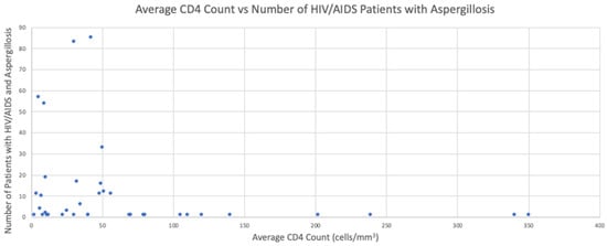 The average CD4 count vs. number of HIV/AIDS patients diagnosed with aspergillosis. Results taken from the 54 publications reviewed.