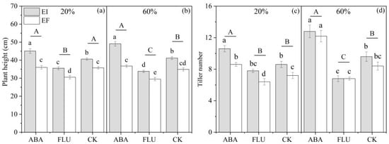 Plant height and tiller number of A. inebrians seedlings, endophyte-uninfected (EF) and infected (EI), under different exogenous ABA content and two soil water contents. Columns with non-matching lowercase letters indicate a significant difference between different treatments under the same water content at p < 0.05. Columns with non-matching capital letters indicate a significant difference between different ABA treatments under the same water content at p < 0.05. The same below. (a,c): 20% water content, (b,d): 60% water content.