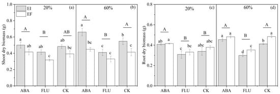 Shoot dry biomass and root dry biomass of two different soil water contents of A. inebrians seedlings, endophyte-uninfected (EF) and infected (EI) under different exogenous ABA content (g). (a,c): 20% water content, (b,d): 60% water content.