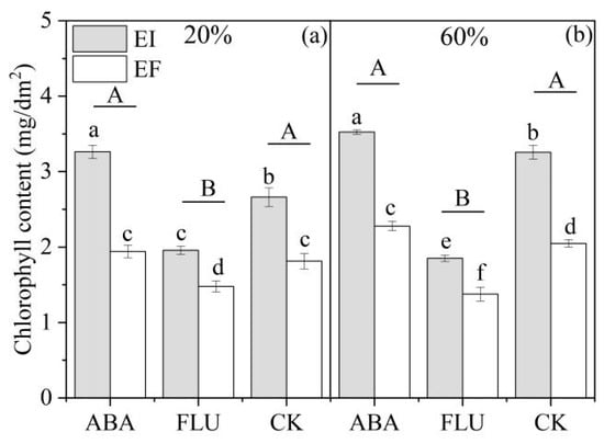 After sixty days, the watering of the pots was ceased so that the water-holding capacity (WHC) of half of the EI and EF pots could be reduced to 20% relative soil water content (SWC)(drought), and the SWC of the other pots was reduced to 60% SWC (abundant moisture). Abscisic acid and fluridone (ABA biosynthesis inhibitor) were dissolved in distilled water individually to give a concentration of 1 mg/L of each. Each soil water-holding capacity condition for EI and EF seedlings was assigned to 30 pots, and the leaves of seedlings of 10 pots were sprayed with ABA solution, ten pots were sprayed with fluridone (FLU) solution, and the remaining ten pots were sprayed with distilled water as the control (CK). A total of 12 treatments, and ten replicates per treatment were used in this experiment. Every afternoon of the trial at six o’clock, each pot was weighed, and water was added to maintain the required SWC. After watering, the position of every pot was changed randomly. Foliar spraying of every plant was carried out twice at seven-day intervals with a constant volume of 7 mL/plant of ABA or FLU solution with a manual sprayer at the 6–7 leaf-growth stage. Control plants were sprayed similarly with an equivalent amount of distilled water [49]. All solutions included 0.002% tween-20 and 0.1% ethanol (a minimum amount to dissolve the FLU and ABA) to promote the uptake of ABA and FLU [50]. After 4 weeks, chlorophyll content, photosynthetic indexes, and chlorophyll fluorescence were determined.