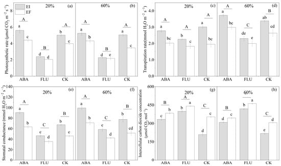Photosynthetic rate (μmol CO2 m−2s−1), transpiration rate (mmol H2O m−2s−1), stomatal conductance (mmol H2O m−2s−1), and intercellular carbon dioxide concentration (μmol CO2 mol−1) of endophyte-uninfected (EF) and infected (EI) A. inebrians seedlings, at two soil water contents and different exogenous ABA contents. (a,c,e,g): 20% soil water content, (b,d,f,h): 60% soil water content.