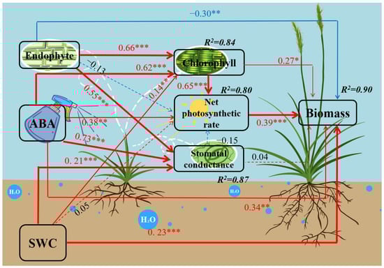 The final model results of structural equation modeling (SEM) analysis for endophyte, abscisic acid, and water factors on biomass of A. inebrians seedlings. Dotted arrows, insufficient statistical evidence for path coefficients (p > 0.05). Blue arrows indicate evidence for negative relationships, and red arrows indicate evidence for positive relationships. The proportion of variance explained (R2) appears alongside each response variable in the model. Width of the arrows shows the strength of the causal relationship, and the numbers adjacent to arrows are standardized path coefficients, which reflect the extent of the relationship, while asterisks indicate statistical significance (*** p < 0.001; ** p < 0.01; * p < 0.05). The final model adequately fitted the data: χ2 = 0.662, P = 0.956, RMSEA < 0.001, GFI = 0.997, AGFI = 0.978, RFI = 0.992.