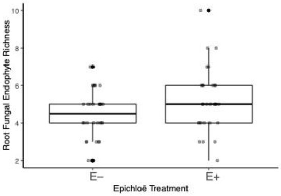 Root fungal endophyte species richness per plot from Ammophila plants where Epichloë was either present or absent. Treatment medians and quartiles shown, with points jittered to aid with viewing. Darker circles indicate overlapping data points.
