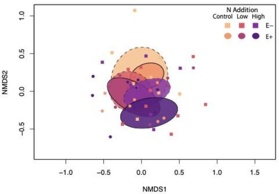 Nonmetric multidimensional scaling plot displaying differences in root endophyte community composition among Epichloë and N addition treatments. 2D stress = 0.2. Ellipses represent standard deviation of point scores for each treatment interaction. Dashed lines represent E− plots.