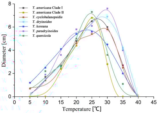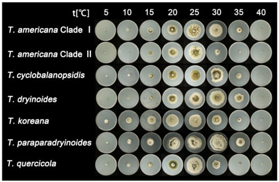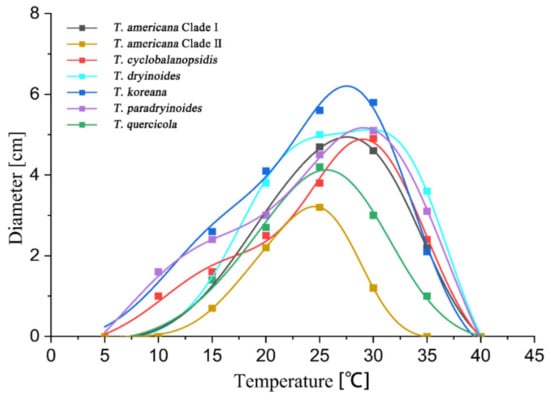 | Tubakia americana clade I | PDA | 0 | 1.7 ± 0.1 | 2.7 ± 0.1 | 4.8 ± 0.2 | 6.5 ± 0.2 | 6 ± 0.3 | 2.7 ± 0.1 | 0 |