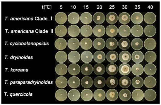 | Tubakia paradryinoides | PDA | 0 | 1.9 ± 0.1 | 3.6 ± 0.1 | 5.8 ± 0.2 | 6.1 ± 0.2 | 7.6 ± 0.2 | 4 ± 0.1 | 0 |