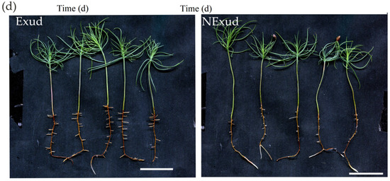 (b) Exudate effects: a P. massoniana seedling was transplanted onto DCR medium (30 mL) in 13 cm × 13 cm Petri dishes. A cellophane membrane was placed over the roots and then covered with a thin layer of MMN medium. The MNM medium was then inoculated with an S. bovinus plug (1 cm in diameter) (Exud treatment). Plates that were not inoculated with S. bovinus were considered to be controls (NExud treatment).